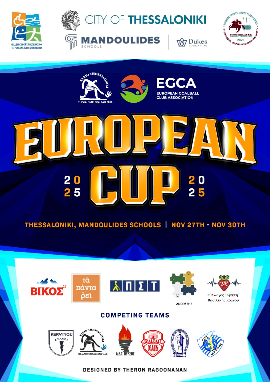 The first ever EGCA European Cup was held in the city of Thessaloniki, Greece from 27th to 30th November 2025 head organized by Kleio Thessaloniki in cooperation with European Goalball Club Association. The tournament was played at the Sport Hall of the Mandulides Schools (address: 12th km of the Thessaloniki – Nea Moudania National Road, Thermi, 57001, THESSALONIKI). Floor material of the hall is wooden parquet. The teams and referees were accommodated at the Ambassador Hotel, that is located only 15 minutes drive from the venue and 10 minutes drive from the Thessaloniki Airport.
